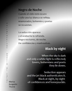 Black by night, poetry – Negro de noche, poesía Arte -Art Número 2 - Marzo 2018 Poesías 8 de marzo de 201828 de abril de 2018 Mag.. Marisa Avogadro Thomé Escritora argentina marisaavogadro@uolsinectis.com.ar
