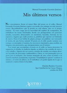 Mis últimos versos: nuevo poemario del escritor mexicano Manuel Fernando Guzmán Jiménez Archivo - Archive Diciembre 2018 Noticias - News 28 de diciembre de 2018 El 2 de diciembre, el escritor y poeta mexicano Manuel Fernando Guzmán Jiménez presentó su tercer libro “Mis últimos versos”, en el Salón México II del Hotel Hilton Expo en Guadalajara, en el evento FIL Abuelos, de la Feria Internacional del Libro en Guadalajara (FIL Guadalajara). Mis últimos versos fue editado en Acento Editores, en Guadalajara, México. El prólogo fue escrito por Darinka Ramírez Guzmán. La fotografía de tapa de Manuel Fernando Guzmán Jiménez. Diseño editorial y de cubierta, José Reyes González Flores. Cuidado de la edición, María del Socorro Guzmán Muñoz. El poemario de 200 páginas reune más de 70 poemas del autor. Para citar algunos: Ya no vuelvas; De gatos; Al maletilla; Licor para olvidar; La Manzanilla, entre otros. Prólogo del libro por Darinka Ramírez Guzmán Los últimos versos del poeta de pies ligeros Cuando las aves hablan con las piedras Y las ranas con las aguas- Es de poesía que están hablando. Manoel de Barros Nos encontramos frente al tercer libro del poeta en el exilio, Manuel Fernando Guzmán Jiménez; quien a su modo, nos entrega sus más sinceros versos. Recordándonos que la poesía no está afuera, sino en el propio interior. El verso surge por la necesidad del espíritu de compartirse, de embellecer las horas transitadas; donde sus protagonistas son personas amadas, recuerdos almacenados en anécdotas, leyendas, historias de los espacios y lugares que nadie poetiza ya, palabras que esperan ser habitadas de nuevo. Tiene él un hablar de pájaro, porque sus palabras van verseando al viento, de una forma natural. El poeta en el exilio puede sentarse con sosiego a contemplar el camino, los recovecos transitados, para escribir; sin ninguna otra pretensión, que transparentarse con él mismo. El poeta brasileño Manoel do Barros decía que la importancia de cualquier cosa no podía ser medida por algún sistema cegesimal; sino, por el encanto que esa cosa producía en nosotros. Por ello, el mundo interno de Manuel Fernando es cristalino, donde habita un jardín rebosante de cosas, memorias, atardeceres y albas primorosas. Sus versos me recuerdan el cuento de Eduardo Galeano: “La casa de las palabras”, donde los poetas solían ir a encontrar palabras almacenadas en viejo frascos. Las palabras les suplicaban a los poetas ser tomadas, olidas, saboreadas. Ellos entonces se deleitaban o fruncían sus narices con cada una de ellas. Las reconocían, las encontraban, las descubrían por primera vez. Así cada poeta se iba sirviendo de las palabras que más necesitaba. Dichoso él, que tiene la fortuna del tiempo, para apreciar la belleza de las palabras y de las cosas, de las partículas pequeñas que componen el cotidiano. Ya en su primer libro, Versos Vivos, nos podemos deleitar con su poesía sobre lo cotidiano. En el segundo, José Reyes afirma que lo cotidiano en Manuel Fernando “es lo sustantivo y lo sustancial de la vida”, tal como hace presencia en Más versos vivos. El poeta en el exilio trasluce el canto de su corazón al papel; invitándonos por tercera ocasión, a ser partícipes de su universo poético, dialogando y recordándonos el regalo que es cada instante. Sus lecturas -literarias, cotidianas, musicales- permean su lenguaje. Los temas que acompañan al poeta en el exilio se hacen presentes: la migración, la familia, la tradición tapatía, su afición a las corridas de toros y a los caballos. Algunos de sus versos, a modos de corrido, nos relatan diversas leyendas de personajes emblemáticos. Otros, se ven permeados por su gusto por el mariachi y las formas musicales de este; como el bolero o la canción ranchera. Justamente, su poema “Guadalajara te quiero” contiene la música y el color de Jalisco; en él embellece a la perla tapatía de la que se enamoró y tantos frutos le ha dado. Nos comparte la belleza y peculiaridad de diversas ciudades como Culiacán, Las Vegas, San Antonio; lugares que frecuenta con sus pies pluma, como los llama José Reyes. También nos deja descubrir la tradición y beldad de paisajes de varios pueblos de Michoacán y Jalisco. Diversos elementos naturales se vuelven sus protagonistas como el río, el mar, la luna; los cuales, no dejan de impresionarle y de mostrarle la magnificencia natural. Se da el gusto de compartirnos versos de amor y desamor, de esperanza y encono. Su compañera de vida, quien le acompaña por casi seis décadas, sigue siendo su musa e inspiración de vida y versos. Por otro lado, el autonombrarse: poeta en el exilio, además de ser un referente por sus múltiples viajes en diversos espacios, nos habla de una memoria más antigua, de un pasado distante, donde rememora a sus ancestros andariegos. Tal como su abuelo español, a quien le dedica el poema: “Desconocido”; quien dejó el Mediterráneo para navegar y llegar a territorio mexicano. Él ha sido inspiración constante en sus versos: Cruzó el mar para hacer historia él siguió la ola y logró la gloria. Por siempre tendrás un lugar serás tú mi faro y mi guía al final. Este es un regalo a un gran navegante que sin ser marino cruzó siete mares. Manuel Fernando ha sido un migrante en carne propia, y habla en voz de quienes fueron, quienes retornaron, quienes transitan al otro lado. Les habla a los dreamers, a los deportados, a los que ya no regresaron más. Lo hace desde su propia verdad, desde su experiencia. Es un poeta del pueblo, habla para él y de él; por eso la gente se identifica. No por ello es fortuito que en radios de diversas latitudes de México y de Estados Unidos han sentido el mismo latir del poeta; su voz, es la voz de ellos. Un hombre que se abre a la verdad; a su verdad y ante ella, ningún otro puede negarla. Él ha sido de los afortunados migrantes que ha podido ir y retornar. Podemos verlo en su poema 