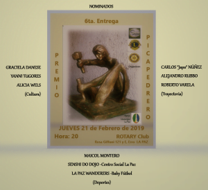 Se entregarán los Premio Picapedrero en La Paz -Uruguay Archivo - Archive Enero 2019 Noticias - News 24 de enero de 2019 Se realizará en La Paz, Canelones, Uruguay, la 6ta entrega de los «Premio Picadrero», el jueves 21 de febrero a las 20 hr en la sede del Rotary Club. La distinción se otorga en las áreas cultura, trayectoria y deportes. En cultura están nominadas: Graciela Danese, Yanni Tugores y Alicia Wels. En trayectoria: Carlos Nuñez, Alejandro Rubbo y Roberto Varela y en deportes: Senshi Do Dojo – Centro Social La Paz y La Paz Wanderers – Baby fútbol. La imagen de los premios es la escultura » El Picapedrero» del artista plástico uruguayo Miguel Méndez Furtado, realizada en el año 1998 como homenaje al forjador de la ciudad de La Paz, fundada el 28 de febrero de 1872. Para mayores informes pueden comunicarse con Miguel Méndez al e-mail: miguelmendezfurtado@gmail.com