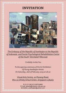Exhibition of Young Azerbaijan Artists in Singapore Archivo - Archive Febrero 2019 Noticias - News 2 de febrero de 2019 The Embassy of the Republic of Azerbaijan to the Republic of Indonesia and Social – Psychological Rehabilitation Centre of the Youth «Dirchelist» (Revival) invite you to the opening ceremony of the Art Exhibition of Young Azerbaijan Artists on Saturday, on 16 st of February at 18:00 p.m. in the Visual Arts Centre of Singapure, 10 Penang Road, #01-02 Dhoby Ghaut Green, Singapore 238469. The exhibition is from February 17th to 19 th. Thirteen Azerbaijani young artists participate in this exhibition in Singapore and eighty art works are exhibited there. Participants: Aysun Hasanova, Aydan Nabizade; Banu Davali, Firangiz Huseynova, Kamala Jafarzade, Kanan Hasanguliyev, Khanim Mammadova, Narmina Aliyeva, Nazrin Sadigova, Selin Sadigova, Rashida Guliyeva, Safranda Mammadova and Roza Muradova. Exhibitions aim at developing intercultural dialogue by virtue of cultural activity. Thus, hundreds of painting works of the dozens of our young and talented painters were displayed during these exhibitions. The exhibitions aimed at introducing the culture of Azerbaijan in other countries, facilitating integration and developing intercultural dialogue behind the borders by virtue of cultural activity. About the Center The Center of Social-Psychological Rehabilitation of the Youth – “Dirchelish”(Reival) operating in Azerbaijan since 1999. The NGO “Dirchelish” is a non-governmental, non-profit and non-political youth organization which activity was focused on comprehensive development of young people with disabilities, from families with various serious social problems and young people living in areas of country where socio-economic development is not enough developed. It focuses on assisting young people with disabilities especially those coming from disadvantaged families and those who live in underdeveloped areas of Azerbaijan. During ten years NGO “Dirchelish” have implemented more than 100 different projects in Azerbaijanand beyond its borders. and cooperate with the European Youth Foundation of the Council of Europe. Young members of our NGO have taken part at the seminars and trainings held in the European Youth Centers in Strasbourg, Budapest, and Reykjavik. The NGO “Dirchelish” has also issued books, information bulletins, aired TV talk-shows, published over 200 various publications in mass media, taken a series of steps to raise awareness of the problems of disadvantaged youth through large-scale media coverage, as well as organized conferences, round-table discussions, cultural events, painting exhibitions, workshops, and conducted disability-related studies through its projects. This event is a continuation of an exhibition, which we had held in: Sofia, Republic of Bulgaria, 11-18 September 2010; Brussels, Kingdom of Belgium, 24 – 31 March 2011; Vienna,Republic of Austria, February 5-12, 2012; Paris, Republic of France 23-30 March 2012; Rome, Republic of Italy, May 29 – June 5, 2012; London, United Kingdom of Great Britain, 17-24 March 2013; Brussels, Kingdom of Belgium, 16-23 June 2013; Milan, Republic of Italy, 22-29 November 2013; Budapest, Republic of Hungary, 13-19 May 2014; Bern, Swiss Confederation, 13-20 October 2014; Waterloo, Kingdom of Belgium, 21 January – 20 February 2015; Prague, Czech Republic, 4-11 May 2015; Warsaw, Republic of Poland, 20-27 May 2016; Brussels, Kingdom of Belgium, 20-26 June 2017; Luxembourg, Grand Duchy of Luxembourg, 27-29 June 2017; Strasbourg, Republic of France, 27 May – 3 June 2018; Paris, Republic of France, 3 – 10 July 2018; Dubai, United Arab Emirates, 30 October-6 November 2018. 18 exhibitions were held in Europe and East. Nearly 325 Azerbaijani young artists participated in these exhibitions and about 1596 works of art were exhibited. Thus, hundreds of painting works of the dozens of our young and talented painters were displayed during these exhibitions. The Center of Social-Psychological Rehabilitation of the Youth – “Dirchelish” (NGO «DIRCHELISH»), a real candidate as a NGO for recoding into the Guinness Book of records for the number of exhibitions and demonstrated art works. For further information to contact: Islam Bakhshaliyev. Ambassador for Peace. Director of the“Dirchelish”-the Center of Social-Psychological Rehabilitation of the Youth. e-mail: dirchelish_azerbaijan@yahoo.com