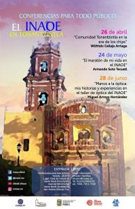 El INAOE en Tonantzintla -México: Ciclo de conferencias Abril 2019 Archivo - Archive Noticias - News 23 de abril de 201923 de abril de 2019 Entrada libre Conferencias para todo público. Horario: 18 hr Lugar: Casa de Cultura de Santa María Tonantzintla, Av. Reforma Sur. Santa María de Tonanzintla, San Andrés Cholula, Puebla, México Mayor información: Difusión Científica – difusion@inaoep.mx