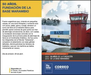 Emisión postal con motivo del Cincuentenario de la Fundación de la Base Marambio Abril 2019 Archivo - Archive Ciencias y Comunicación - Science and Communication 27 de abril de 201927 de abril de 2019 Fuente: Fundación Marambio Fundación Marambio – Buenos Aires, Argentina info@marambio.aq Año del Cincuentenario de la Base Antártica Marambio 1969/2919 Lunes 29 de abril de 2019 Filatelia del Correo Argentino emitirá una serie postal en homenaje al 50 aniversario de la fundación de la Base Marambio de la Antártida Argentina (1969 – 29 de octubre – 2019). Conjuntamente, hemos colaborado brindando material gráfico e histórico, informando detalles sobre este acontecimiento para su desarrollo. El diseño de alta calidad artística que hace a esta emisión se ve reflejado en las piezas que aquí publicamos. Las mismas estarán disponibles en todas las Sucursales Filatélicas de la Argentina y por Internet, a partir del próximo día lunes 29 de abril de 2019. El lanzamiento oficial de la misma se proyecta para el mes de junio, en conmemoración del Dia de la Confraternidad Antártica – 21 de junio, (fecha que la mitad de las provincias ya lo tienen incorporado por ley en su Calendario Escolar). Tienda filatélica en Internet AQUÍ. Tienen que registrarse AQUÍ. Sucursales Filatélicas en la Argentina, haga clic AQUÍ. Información filatélica La filatelia es la afición por coleccionar y clasificar sellos, sobres y otros documentos postales, así como estudiar la historia postal. Un sello postal, también conocido como estampilla, estampa, sello, o timbre, es un comprobante del pago previo de los envíos efectuados por correo en forma de etiqueta, generalmente engomada, o directamente impreso. En esta Fundación, conscientes de la importancia de la filatelia, en el Museo Antártico de la Fundación Marambio, junto a cada elemento o imagen con explicación de lo que se exhibe, además del código de barra QR, para que con el celular pueda capturar toda la información escrita e imágenes sobre ese tema; se encuentran sobres postales filatélicos, con el matasello que mencionan la fechas, a modo de certificación de esos hechos históricos. Además en dicho museo está el denominado Rincón Filatélico Antártico, que lleva el nombre de “Comodoro Salvador Alaimo”, quién fue un conocido coleccionista de sellos, sobres y marcas postales relacionadas con la temática de Antártida e Islas Malvinas; en el que se exhiben piezas postales filatélicas que certifican diversos acontecimiento antárticos. Estampillas de la emisión Matasello Sobre del día de la emisión