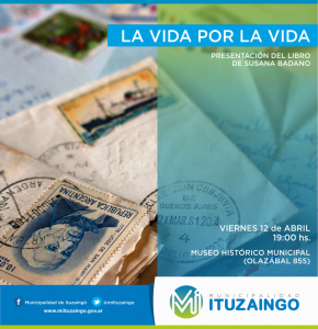 Presentarán el libro «La vida por la vida» en el Museo Histórico Municipal de Ituzaingó Abril 2019 Archivo - Archive Noticias - News 10 de abril de 201910 de abril de 2019 El viernes 12 de abril a las 19 hr se presentará el libro La vida por la vida de la escritora Susana Badano, en el Museo Histórico Municipal de Ituzaingó, Buenos Aires, Argentina. Estarán presentes en el acto conocidos músicos, periodistas, cineastas, historiadores y habrá un cierre musical con Beatriz Cappagli y Walter Soria. La presentación es abierta a todo público, con entrada libre y gratis y se realizará en el Museo Histórico Municipal de Ituzaingó, ubicado en la calle Olazábal 855 de Ituzaingó, Buenos Aires, Argentina. Para mayor información pueden comunicarse con el siguiente correo electrónico: museohistoricomunicipal@gmail.com Facebook: Museo Histórico Municipal de Ituzaingó Instagram: museoituzaingo