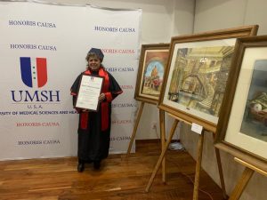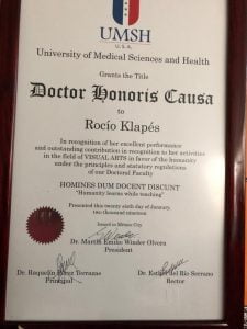 Rocio Klapés, artista mexicana, recibe la distinción Doctor honoris causa Abril 2019 Archivo - Archive Noticias - News 28 de abril de 201929 de abril de 2019 Foto gentileza de la artista mexicana Rocío Klapés La conocida artista méxicana Rocío Klapés, Miembro del Consejo Editorial Internacional de Revista Diafanís, recibió la distinción Doctor honoris causa, en reconocimiento de su excelente desempeño y sobresaliente contribución de sus labores en el campo de las artes visuales a favor de la humanidad bajo los principios y regulaciones estatutarias de la facultad doctoral: La humanidad aprende al enseñar, otorgado por University of Medical Sciences and Health, el 26 de enero de 2019. A continuación se comparten las palabras expresadas por la artista en el acto de distinción: «Soy Rocío Klapés artista plástica y miembro de la Asociación de Artistas Plásticos de México, A.C. afiliada a la UNESCO. Tengo 26 años de docente en distintas instituciones, Insituto Cultural Helénico, Museo Nacional de la Acuarela, Universidad Autónoma Metropolitana-Campus Xochimilco, Tecnológico Superior de Valuación, Clínica de adicciones, Hospital del IMSS embarazo de alto riesgo. Después de dar clases en dicha clínica me di cuenta y constaté como las artes mejoran la mente y el espíritu de las personas. He participado en proyecto de hacer murales y el tema deja la reflexión en los niños, como los valores morales, la identidad, la contaminación etc. Acercando el arte a los chicos. El arte en cualquiera de sus variantes desarrolla su imaginación y creatividad, adquiriendo más seguridad, eleva la autoestima, la fineza en la percepción y motricidad, capacidad intuitiva para resolver mejor cualquier reto, dejan de ser agresivos, mejora su estrés y tensión diaria, comparten más y los hace mejores personas. Agradezco a la University of Medical Sciences and Heath por tan importante reconocimiento. Dicen que los reconocimientos llegan cuando uno ya no los necesita…..¡¡yo si lo necesitaba para seguir adelante!! Fotos gentileza de la artista Rocio Klapés