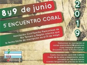Encuentro Nacional de Coros Italo-piemonteses «Il fiume canta 2019» en la Argentina Archivo - Archive Mayo 2019 Noticias - News 4 de mayo de 20194 de mayo de 2019 Se realizará el 5to Encuentro Nacional de Coros Italo-piemonteses «Il fiume canta 2019» en Río Tercero, provincia de Córdoba, Argentina, del 8 al 9 de junio del corriente año. Los coros interesados en participar, pueden comunicarse para solicitar los requisitos de participación, del repertorio, inscripción, estadía, entre otros, al celular: 3571 577489 y/o al correo electrónico: Delispiemontesa@hotmail.com