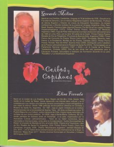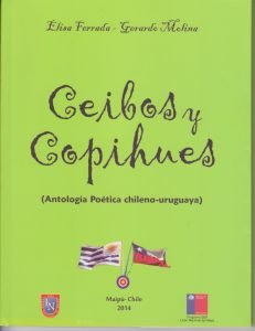Presentarán Ceibos y Copihues una antología poética chileno uruguaya Archivo - Archive Mayo 2019 Noticias - News 21 de mayo de 2019 Presentarán el martes 21 de mayo el libro «Ceibos y Copihues» (antología poética chileno- uruguaya) de Elisa Ferrada (Chile) y Gerardo Molina (Uruguay). El acto tendrá lugar en el Pabellón del Bicentenario a las 15.15 hr e invita la Escuela N 149 Ansina de Uruguay. La obra fue aprobada para Educación Secundaria en Maipú, Chile y fue publicada por la Corporación Municipal de aquella ciudad, en el marco del Programa de Mejoramiento Educativo, con los auspicios del Ministerio de Educación de Chile. El libro de 180 páginas reúne más de cien poemas de ambos autores y se estructura en cinco partes: Campo, Familia, De la Poesía y del Amor, Varia y Por los Caminos de la Historia.