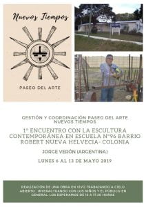 Primer encuentro con la escultura contemporánea en mayo en Nueva Helvecia Archivo - Archive Mayo 2019 Noticias - News 3 de mayo de 2019 Se realizará el Primer encuentro con la escultura contemporánea en la Escuela Nro 96 Barrio Robert en la ciudad de Nueva Helvecia, del departamento de Colonia, en Uruguay ,del 7 al 13 de mayo. Este encuentro ha sido gestionado y será coordinado por Paseo del Arte Nuevos Tiempos, a cargo de Sergio Olivera y Susy Fontes. En esta ocasión se contará con la presencia del escultor argentino Jorge Verón que estará trabajando en vivo los días referidos, de 13 a 17.30hs e interactuando con los niños y público en general dejando una obra para dicho centro educativo.