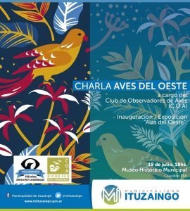 Charla Aves del Oeste en el Museo Histórico Municipal de Ituzaingó en Buenos Aires Archivo - Archive Noticias - News Número 6 - Julio de 2019 18 de julio de 2019 Se inaugura la exposición «Alas en el Oeste» – Aves de la Provincia de Buenos Aires, el viernes 19 de Julio a las 18 hs en el Museo Histórico Municipal sito en Gral. Félix Olazábal 855, de Ituzaingó, Buenos Aires, Argentina. Se realizará una charla sobre aves urbanas a cargo del Club de Observadores de Aves (C.O.A.) «Bicho Feo». Durante la exposición, podrán apreciar fotos, nidos, plumaje, huesos, y más; un mural de alas para sacarse fotos, taller de arte para niños y niñas y juegos. Organizado por: Museo Histórico Municipal de Ituzaingó – Dirección de Cultura – Dirección de Políticas Ambientales Ituzaingó es Ambiente– Club de Observadores de Aves (C.O.A.) «Bicho Feo» COA Bicho Feo Ituzaingó. Museo Histórico Municipal de Ituzaingó – Olazábal 855, Ituzaingó , Buenos Aires, Argentina- Tel.: 4624-2943 Facebook: Museo Histórico Municipal de Ituzaingó Instagram: museoituzaingo