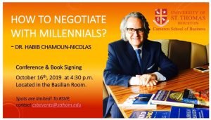 How to negotiate with Millennials -Nuevo curso del Dr Habib Chamoun Nicolás en Houston, Texas Archivo - Archive Ciencias y Comunicación - Science and Communication Setiembre 2019 29 de septiembre de 201929 de septiembre de 2019 Informes: Hchamoun@me.com El Dr. Habib Chamoun-Nicolás el 16 de octubre dictará un nuevo curso: How to negotiate with Millennials (Cómo negociar con Millennials) en Cameron School of Business de la Universidad de St Thomas en Houston, Texas, Estados Unidos. Se realizará una conferencia y además firmará sus libros. El encuentro es a las 4:30 hr p.m en la Sala Basilia. Las entradas son limitadas y deben realizarse las reservas al siguiente e-mail: csbevents@stthom.edu Acerca del Dr Habib Chamoun-Nicolás El Dr Habia Chamoun-Nicolás es un reconocido conferencista, coach y facilitador empresarial y gubernamental desde hace más de dos décadas. Ha diseñado programas de capacitación, de planeación y negociación para gobiernos y empresas. Realizó estudios profesionales y de postgrado en administración de negocios e Ingenieria Química en el Tecnológico de Monterrey. Se recibió en la maestría y doctorado de los Departamentos de Petróleo e Ingeniería Química de la Universidad de Texas en Austin y obtuvo un Post-Doctorado trabajando con la petrolera francesa Elf-Aquitaine (Total) en investigación de producción de petróleo, además ha participado en programas ejecutivos de Negocios de la Universidad Internacional de Negocios de Carolina del Sur, así como del Programa de Negociación de la Universidad de Harvard. Obtuvo el equivalente a una maestría de negocios utilizando la teoria de negocios en la práctica desde la prospección, presentación, propuestas hasta el cierre de proyectos de servicios en varios estados de la union americana, con clientes desde el Gobierno de Estados Unidos, Petroleras, Industriales, Comerciales, Institucionales y distintas areas de negocios.. Hasta la fecha ha impartido entrenamiento a más de 50,000 participantes tanto en cursos ejecutivos en empresas como en la maestría de negocios en Estados Unidos provenientes de Arabia Saudita, Albania, Argentina, Austria, Australia, Barbados, Bermudas, Brasil, China, Colombia, Ecuador, España, Estados Unidos de Norteamérica, Francia, Finlandia, Inglaterra, Irlanda, Estambul, Italia, Kenya, México, Polonia, Puerto Rico, Portugal, Rusia, Suiza, Ucrania, Jamaica, Macedonia, Noruega, Panamá, República Dominicana, Slovakia, Kosovo, Venezuela, Honduras, Guatemala, Guinea Ecuatorial entre otros. Autor varios libros y publicaciones por mencionar algunos: DESARROLLO DE NEGOCIOS, 3ra. Edición 2003. TRATO HECHO, Guía para una Negociación sin Fallas, 2003. Negotiate Like a Phoenician, 2007 Trasciende Quo Vadis Negociador 2016 Por su libro DEAL recibió el honor de ser nombrado el escritor del año 2005 en Houston. Contactar: hchamoun@me.com 713-854-0197