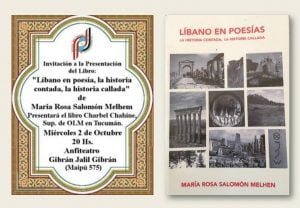 El miércoles 2 de octubre, a partir de las 20hr, se presentará el libro Líbano en poesía, la historia contada, la historia callada; de María Rosa Salomón Melhem, escritora de Tucumán, Argentina, en el Anfiteatro Gibrán Jalil Gibrán.