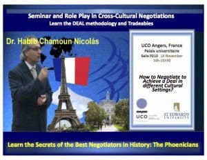 Séminaire multiculturel de négociation en France -Seminario multicultural de negociación en Francia Archivo - Archive Noticias - News Octubre 2019 26 de octubre de 201926 de octubre de 2019 El Dr. Habib Chamoun-Nicolás, Miembro del Consejo Editorial Internacional de la Revista Diafanís, realizará el 14 de noviembre el Seminario multicultural de negociación, en la Universidad Católica del Oeste en Angers, Francia, en conjunto con la University of St Edwards de Austin, Texas, Estados Unidos. En el evento participarán estudiantes del proyecto Erasmus de todo el mundo y se abordará la temática de cómo negociar con diferentes culturas, utilizando la sabiduría fenicia.. Informes: hchamoun@me.com 713-854-0197 Acerca del Dr Habib Chamoun-Nicolás El Dr Habia Chamoun-Nicolás es un reconocido conferencista, coach y facilitador empresarial y gubernamental desde hace más de dos décadas. Ha diseñado programas de capacitación, de planeación y negociación para gobiernos y empresas. Realizó estudios profesionales y de postgrado en administración de negocios e Ingenieria Química en el Tecnológico de Monterrey. Se recibió en la maestría y doctorado de los Departamentos de Petróleo e Ingeniería Química de la Universidad de Texas en Austin y obtuvo un Post-Doctorado trabajando con la petrolera francesa Elf-Aquitaine (Total) en investigación de producción de petróleo, además ha participado en programas ejecutivos de Negocios de la Universidad Internacional de Negocios de Carolina del Sur, así como del Programa de Negociación de la Universidad de Harvard. Obtuvo el equivalente a una maestría de negocios utilizando la teoria de negocios en la práctica desde la prospección, presentación, propuestas hasta el cierre de proyectos de servicios en varios estados de la union americana, con clientes desde el Gobierno de Estados Unidos, Petroleras, Industriales, Comerciales, Institucionales y distintas areas de negocios.. Hasta la fecha ha impartido entrenamiento a más de 50,000 participantes tanto en cursos ejecutivos en empresas como en la maestría de negocios en Estados Unidos provenientes de Arabia Saudita, Albania, Argentina, Austria, Australia, Barbados, Bermudas, Brasil, China, Colombia, Ecuador, España, Estados Unidos de Norteamérica, Francia, Finlandia, Inglaterra, Irlanda, Estambul, Italia, Kenya, México, Polonia, Puerto Rico, Portugal, Rusia, Suiza, Ucrania, Jamaica, Macedonia, Noruega, Panamá, República Dominicana, Slovakia, Kosovo, Venezuela, Honduras, Guatemala, Guinea Ecuatorial entre otros. Autor varios libros y publicaciones por mencionar algunos: DESARROLLO DE NEGOCIOS, 3ra. Edición 2003. TRATO HECHO, Guía para una Negociación sin Fallas, 2003. Negotiate Like a Phoenician, 2007 Trasciende Quo Vadis Negociador 2016 Por su libro DEAL recibió el honor de ser nombrado el escritor del año 2005 en Houston. Contactar: hchamoun@me.com 713-854-0197