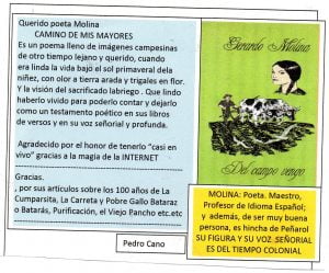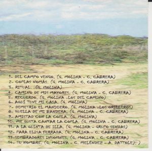 Diez años del disco «Del Campo Vengo» Archivo - Archive Ciencias y Comunicación - Science and Communication Diciembre 2019 27 de diciembre de 2019 Gerardo Molina. Profesor – Poeta y Escritor . Uruguay gerardomolinacastrillo@gmail.com Diez años del disco Del Campo Vengo Primer trabajo compartido con el notable músico e intérprete César Cabrera. Grabación que nos ha dado muchas satisfacciones. Con artistas invitados: Los Orilleros (“Demetrio El Manicero”), Grupo Sendas (“A la Quinta de Illa”), Carlos Meléndez (“Recuerdo”), Luis Esquivel y Antonio Dáttole (“Tu nombre”). 14 temas, todos con letras de mi autoría; en la música: César Cabrera, Los Orilleros, Sendas, Carlos Meléndez y Antonio Dáttole. Y los más variados ritmos. Desde una huella hasta una milonga rock; desde una chacarera hasta un tango. El antecedente fue mi libro del mismo nombre publicado en 2007. Del campo vengo (Recitado) Amarillo delirio de los espinillos. Sangra sus rubíes el ceibo. Del monte traigo a mi regreso, matecitos del molle como recuerdo. Mi canto endulzan frutos del tala como estrellitas redondas, gualdas. ¡»Talitas» que vuelven como un canto de oro desde mi infancia! (Cantado) Con un silbo de otoño del campo vengo traigo un perfume gualda para su pelo. Mieles de lechiguana como sus besos y para el mal de amores yuyitos tiernos. Porque mi prenda a veces sufre de celos aunque rudo, la mimo del campo vengo. Desde el sol a la estrella mi campo siembro y dejo en cada surco semilla y sueño. Silbando alguna huella, vidala o cielo, a su lumbre dormida del campo vengo. Letra: Gerardo Molina Música: César Cabrera Altez Camino de mis mayores Milonga Camino de mis mayores, viejo Camino Real, me pierdo en tus soledades donde la memoria está. Vuelve el ayer de tu canto: pentagramas del trigal; los boyeros que te cruzan, silbo y silbo, hacia su lar. Aromas de pan casero, frutos que el trabajo da. Llegan de las huestes gauchas ráfagas de libertad. Tiempo de acendrar la patria, desde el campo a la ciudad. Camino de mis mayores, viejo Camino Real. En cada huella descubro fulgores del caminar pretérito, las carretas que llegan, siguen, se van… Charretes, volantas, carros, pasa un criollo en su alazán, y un paisano con sus bueyes y su zorra… nada más. Tu dulce memoria ocultas seguro al pie de un talar, de tu misma estirpe criolla, viejo Camino Real. Letra de Gerardo Molina Música de César Cabrera Altez https://youtu.be/iYHsEX3PFN0