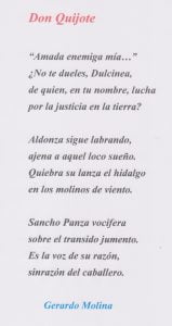 Día del Idioma por Gerardo Molina Abril 2020 Archivo - Archive Noticias - News 22 de abril de 202022 de abril de 2020 Gerardo Molina. Profesor – Poeta y Escritor . Uruguay gerardomolinacastrillo@gmail.com El 23 de abril, celebramos el Día del Idioma, establecido en honor de Miguel de Cervantes, el 13 de octubre de 1946. También es el Día Universal del Libro. Se ha dicho siempre que siete ciudades se han disputado el privilegio de ser la cuna de Cervantes, en 1547 (aunque se ignora mes y día, existe una partida de bautismo del 9 de octubre en Alcalá de Henares, de la que se ha dicho por algunos estudiosos que es apócrifa). Ellas son: Madrid, Toledo, Sevilla, Esquivias, Consuegra, Lucena y Alcázar de San Juan. En nuestra obra “Breverías”, Sudestada, Mdeo., 2009, dedicamos cuatro poesías breves al celebérrimo personaje creado por Cervantes. Compartimos una de ellas: Don Quijote “Amada enemiga mía…” ¿No te dueles, Dulcinea, de quien, en tu nombre, lucha por la justicia en la tierra? Aldonza sigue labrando, ajena a aquel loco sueño. Quiebra su lanza el hidalgo en los molinos de viento. Sancho Panza vocifera sobre el transido jumento. Es la voz de su razón, sinrazón del caballero. Gerardo Molina