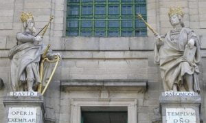 El monarca más poderoso de Europa y con ello del mundo, en cuyo Imperio -según reza el adagio- “no se ponía el sol”, creció convencido de cómo su paso por este mundo estaba orientado a cumplir una importante misión: encarnar la “segunda venida” del rey Salomón. Dicha creencia fue avivada por su padre, el Emperador Carlos V. En este sentido, la propia construcción del Monasterio de El Escorial, sería  el culmen de tal mesianismo, al ser concebido como una especie de “segundo” Templo de Salomón,  Una clara referencia iconográfica a este templo son los cuatro reyes que presiden la entrada del edificio, en el denominado “patio de los reyes”. Si, como se ha afirmado repetidamente, la construcción es un símbolo del poder de los Austrias, lo más lógico hubiera sido colocar esculturas de monarcas anteriores a Felipe II pertenecienes a esta dinastía; máxime cuando uno de ellos, su padre, había sido nombrado nada menos que Emperador del Sacro Imperio Romano Germánico. Por el contrario los reyes que aparecen son: