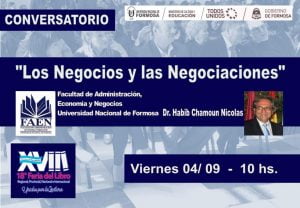 Conversatorio y presentación de libros del Dr Habib Chamoun-Nicolás en la Feria del Libro de Formosa Agosto 2020 Archivo - Archive Noticias - News 30 de agosto de 2020 El Dr. Habib Chamoun -Nicolás realizará un conversatorio el día viernes 4 de setiembre a las 10 am (hora argentina) sobre Los negocios y las negociaciones, en el marco de la Feria del Libro de Formosa, conjuntamente con la Facultad de Admistración, Economía y Negocios de la Universidad Nacional de Formosa, este año concretada de modo virtual. Del mismo pueden participar estrudiantes de economía, contador públcio, licenciatura en comercio exterior, docentes y público general. El profesional también presentará sus dos libros Negociando como un fenicio y Trasciende Quo vadis negociador el jueves 3 del corriente, desde las 7 pm, hora de la Argentina. Habib Chamoun-Nicolás, lleva veinte años abocado a los temas de administración y negociación internacional; es profesor en la Universidad St Thomas de Texas, Estados Unidos; Miembro del Consejo Editorial Internacional de Revista Diafanís, entre otras actividades (http://www.revistadiafanis.com.ar/2018/12/dr-habib-chamoun-nicolas-la-ciencia-y-los-negocios-son-mis-dos-pasiones/) Todas la actividades son de acceso libro y trasmitidas de modo electrónico. El enlace para acceder al conversatorio es: https://youtu.be/fFlxn8NPitY Sitio oficial de la Feria del Libro: www.feriadellibroformosa.com.ar
