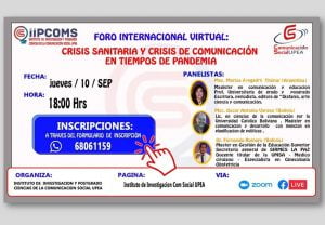 Foro Internacional: Crisis sanitaria y crisis de comunicación en tiempos de pandemia en la Universidad de El Alto – UPEA – Bolivia Archivo - Archive Noticias - News Setiembre 2020 8 de septiembre de 20208 de septiembre de 2020 El jueves 10 de setiembre a las 6 pm hora de Bolivia, se realizará el Foro Internacional Virtual: Crisis sanitaria y crisis de comunicación en tiempos de pandemia, organizado por el Instituto de Investigación y Posgrado de la Carrera de Ciencias de la Comunicación Social de la Universidad Pública de El Alto (UPEA) de Bolivia. En el foro participarán el Dr. Fernando Romero (Bolivia), máster en gestión de la educación superior, Secretario General del SIndicato de Ramas Médicas de la Salud Pública (SIRMES) La Paz, docente titular de la Univerisidad Mayor de San Andrés UMSA y médico cirujano, especialista en ginecología y obstetricia. El Msc. Oscar Antonio Vargas (Bolivia), licenciado en ciencias de la comunicación y magister en comunicación y desarrollo con mención en planificación de políticas y Marisa Avogadro Thomé (Argentina), máster en comunicación y educación, profesora de grado y posgrado, escritora, periodista y directora de la revista internacional Diafanís. Arte, Ciencia y Comunicación. La actividad se llevará a cabo a través de la plataforma Zoom y será retrasmitido por Facebook Live. Las personas interesadas en participar pueden hacerlo completando el formulario que se encuentra disponible en la cuenta oficial de facebook del Instituto: Facebook y/o comunicándose a través de whastsapp con el siguiente número: +591 68061159.