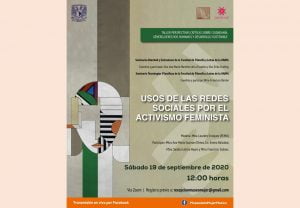 Museo de la Mujer de México: sesión sobre Uso de las redes sociales por el activismo feminista Archivo - Archive Noticias - News Setiembre 2020 15 de septiembre de 2020 El Museo de la Mujer invita a la sesión virtual del mes de septiembre con el tema Usos de las redes sociales por el activismo feminista, del taller de Perspectivas, Críticas sobre Ciudadanía, Género, Derechos Humanos y Desarrollo Sostenible; que moderará la Mtra. Lourdes Enríquez (FEMU) y participarán los siguientes ponentes: Mtra. Ana María Guzmán Olmos, Lic. Emma Baizabal, Mtra Sandra Leticia Reyes y Mtro. Francisco Salinas. El evento es este sábado 19 de septiembre de 2020, a las 12 hr deMéxico. Para interactuar vía Zoom, es necesario registrarse previamente al correo electrónico recepcionmuseomujer@gmail.com; favor de indicar nombre del evento, nombre completo y teléfono de contacto. También será transmitido en vivo por nuestra página oficial de Facebook. Conforme a lo expresado por la Mtra Lourdes Enríquez (FEMU): «En esta sesión se tratará el tema del uso de las redes sociales que han hecho los feminismos activistas y las estrategias que han utilizado para avanzar en sus demandas y agendas por visibilizar las desigualdades y las violencias de género. También analizaremos el influjo de las nuevas tecnologías que favorecen la emergencia del activismo feminista y el debate por una agenda común de lucha». Sitio electrónico del Museo de la Mujer de México: www.museodelamujer.org.mx