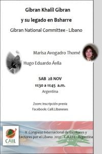 Dos profesionales mendocinos, los escritores: Hugo Eduardo Ávila y Marisa Avogadro Thomé, presentarán la ponencia: Gibran Khalil Gibran y su legado en Bsharreh. Gibran National Committee desde el Líbano, en el marco del V Congreso Internacional de Escritores y Lectores por el Líbano 2020, el sábado 28 de noviembre de 11:30 hr a 11:45 hr de la Argentina.