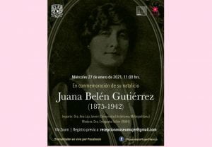 Juana Belén Gutierrez: conferencia virtual – Museo de la Mujer de México Archivo - Archive Enero 2021 Noticias - News 23 de enero de 202123 de enero de 2021 El Museo de la Mujer invita a la conferencia virtual sobre la vida y obra de «Juana Belén Gutiérrez (1875-1942)», en conmemoración de su natalicio. Imparte: Dra. Ana Lau Jaiven (Universidad Autónoma Metropolitana); modera: Dra. Enriqueta Tuñón (INAH). “Juana Belén, una mujer adelantada para su tiempo que fue anarquista, opositora al régimen porfirista, magonista, maderista y zapatista 🗣️ El objetivo de esta actividad es condensar una amplia visión de esta mujer que fue testiga y actora durante la primera mitad del siglo XX. Su sensibilidad, su perseverancia, su participación y las múltiples actividades que realizó la hacen una mujer de su tiempo que bien vale conocer. Juana estuvo al lado de muchos de los intelectuales de la época y participó con ellos en variados levantamientos cuyo objetivo era derribar al régimen de Díaz”, manifestaron las organizadoras La cita es el próximo miércoles 27 de enero a las 16 horas. Para interactuar vía Zoom, es necesario registrarse previamente al correo electrónico recepcionmuseomujer@gmail.com; indicando nombre del evento, nombre completo y teléfono de contacto. Se puede sintonizar también la transmisión simultánea por Facebook.