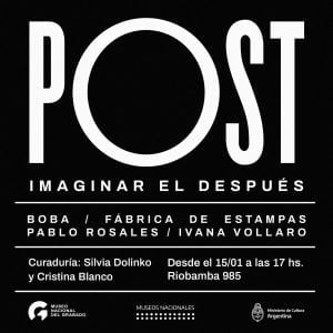 Se inauguró «POST. Imaginar el después» en el Museo Nacional del Grabado Archivo - Archive Enero 2021 Noticias - News 23 de enero de 2021 El Museo Nacional del Grabado inauguró POST. Imaginar el después, una exhibición integrada por obras de Pablo Rosales, Ivana Vollaro y los colectivos Fábrica de Estampas y boba, con curaduría de Silvia Dolinko y Cristina Blanco. La exposición se despliega en planta baja de la calle Riobamba 985, CABA, Ciudad de Buenos Aires, Argentina y puede visitarse, a partir del 15 de enero hasta el 31 de julio, viernes y sábados de 17 a 20, con turno previo. Más información en: museodelgrabado.cultura.gob.ar En Facebook: /MuseoNacionaldelGrabado e Instagram: @mngrabado