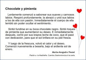 Chocolate y pimienta: un cuento en el Día de San Valentín Archivo - Archive Febrero 2021 Noticias - News 14 de febrero de 202114 de febrero de 2021 Marisa Avogadro Thomé Escritora argentina marisaavogadro@uolsinectis.com.ar