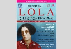 Conferencia sobre Lola Cueto en el Museo de la Mujer de México Archivo - Archive Noticias - News Número 11 - Marzo 2021 1 de marzo de 2021 El Museo de la Mujer invita a la conferencia Lola Cueto (1897-1978), un proyecto educativo diferente, en conmemoración de su natalicio. Será una actividad impartida por la Dra. Rocío García Rey (FEMU), y moderada por la Mtra. Sandra Vázquez (FEMU). La cita es el martes 2 de marzo a las 12 hs am de México. Para interactuar vía Zoom, es necesario registrarse previamente al correo electrónico recepcionmuseomujer@gmail.com; y se debe indicar nombre del evento, nombre completo y teléfono de contacto. Transmisión simultánea por Facebook. Conforme a lo expresado por las organizadoras: «Esta actividad tiene como objetivo dar a conocer la trascendencia que este personaje tuvo tanto en el rubro artístico como en el rubro educativo. La Dra. Rocío García Rey destacará cómo además de ser una de las pioneras del teatro guiñol en México, fue también una mujer preocupada por llevar a la escena obras de teatro educativas encaminadas a alfabetizar». Museo de la Mujer de México: www.museodelamujer.org.mx