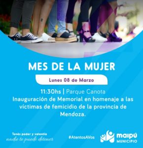 El 8 de marzo se inaugura el Memorial en homenaje a las víctimas de femicidio en Mendoza ubicado en la Estación Canota de Maipú Archivo - Archive Noticias - News Número 11 - Marzo 2021 5 de marzo de 20216 de marzo de 2021 El 8 de marzo a las 11:30 hr, en el Parque Canota de Maipú, Mendoza; se inaugurará el Memorial en homenaje a las víctimas de femicidio de la provincia de Mendoza. La idea surgio a partir del proyecto que presentó la sra Susana González, del departamento de Maipú, mamá de Julieta González, quien fuera víctima de femicidio el 21 de setiembre de 2016, en la provincia. El evento ha sido organizado por la Municipalidad de Maipú y la escultura que será descubierta en el acto, estuvo a cargo del escultor Lautaro Valdivia.