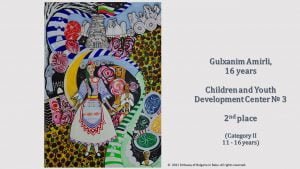 In the category of children up to 10 years old, 8-year-old Maryam Movlamli took first place. Daniz Quliyeva, 10, is second and Zahra Abdurahmanli, 10, third. In the 11-16-year-olds category, 11-year-old Madina Hamzatova ranks first, followed by 16-year-old Gulhanam Amirli, second, and third place goes to 16-year-old Yulker Alieva. 40 children have been awarded. by the jury for their work with special recognitions.