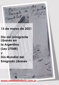 Se conmemora el 13 de marzo el Día del Inmigrante Libanés en la Argentina en coincidencia con el Día Mundial del Emigrado Libanés Archivo - Archive Noticias - News Número 11 - Marzo 2021 11 de marzo de 202111 de marzo de 2021 El 3 de diciembre de 2014 en la Argentina se sancionó la Ley 27048, del Día del Inmigrante Libanés, la cual fue promulgada el 23 de diciembre del mismo año. Dicha ley, expresa que: «ARTÍCULO 1° — Institúyese el segundo sábado del mes de marzo de cada año como Día del Inmigrante Libanés, en coincidencia con el Día Mundial del Emigrante Libanés. ARTÍCULO 2° — Comuníquese al Poder Ejecutivo nacional.» (fuente: http://servicios.infoleg.gob.ar/infolegInternet/anexos/240000-244999/240571/norma.htm) Marisa Avogadro Thomé, periodista, escritora argentina