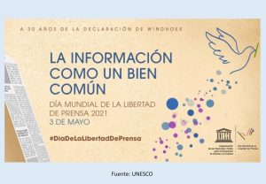 3 de mayo: Día Mundial de la Libertad de Prensa Archivo - Archive Mayo 2021 Noticias - News 3 de mayo de 2021 «La información como un bien común» es el lema bajo el cual la UNESCO propone conmemorar esete año 2021 el Día Mundial de la Libertad de Prensa. «El tema del Día Mundial de la Libertad de Prensa de este año, “La información como un bien común”, subraya la importancia indiscutible de disponer de una información verificada y fiable. También pone de relieve el hecho de que, para producir y difundir esa información, resulta esencial que periodistas libres y profesionales hagan frente a la desinformación y otros contenidos perjudiciales.» – Mensaje de la Sra. Audrey Azoulay, Directora General de la UNESCO [https://es.unesco.org/commemorations/worldpressfreedomday] Desde el sitio oficial de la UNESCO, refieren que: «…el Día Mundial de la Libertad de Prensa 2021 pondrá énfasis en tres imperativos para este ecosistema: Medidas para garantizar la viabilidad económica de los medios de comunicación; Mecanismos para garantizar la transparencia de las empresas de Internet, y Mejora de las capacidades de alfabetización mediática e informacional que permitan a la gente reconocer y valorar, así como defender y exigir, al periodismo como parte fundamental de la información como un bien común. Desde el 3 de mayo de 1993 se conmemora el Día Mundial de la Libertad de Prensa, ya que la Asamblea General de las Naciones Unidas, debido a una recomendación de la Conferencia General de la UNESCO, así lo dispuso. Se eligió esta fecha para que coincidiera con la Declaración de Windhoek, que se convirtió en un documento fundamental sobre la base de los principios de la libertad de prensa. Dicho documento resultó como corolario del seminario que periodistas africanos en el año 1991 realizaron en Namibia. Abogamos por un periodismo en libertad; por la vida de los periodistas; por un trabajo en busca de la verdad, la ética y alejado de la impunidad. Revista Diafanís