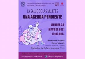 Conferencia: La salud de las mujeres: una agenda pendiente en el Museo de la Mujer de México Archivo - Archive Mayo 2021 Noticias - News 24 de mayo de 2021 El Museo de la Mujer de México invita a la conferencia: La salud de las mujeres. Una agenda pendiente, en conmemoración del Día Internacional de Acción por la Salud de las Mujeres, que será impartida por la Dra. Luz María Moreno Tetlacuilo (Facultad de Medicina-UNAM); modera la Dra. Martha Pérez Armendáriz (FEMU). El evento es el próximo viernes 28 de mayo a las 16 horas de México. En esta sesión se tratará el origen del Día internacional de Acción por la Salud de las Mujeres, las políticas en torno a dicho tema, los principales problemas de salud que las afectan en México y el género como una determinante social de tales afecciones. Se discutirán también las inequidades y desigualdades en la atención de su salud en el ámbito familiar e institucional, así como el autocuidado. Para interactuar vía Zoom, es necesario registrarse previamente al correo electrónico recepcionmuseomujer@gmail.com. Se puede sintonizar también la transmisión simultánea por Facebook.
