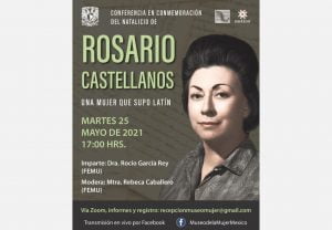 Conferencia: Rosario Castellanos. Una mujer que supo latín en el Museo de la Mujer de México Archivo - Archive Mayo 2021 Noticias - News 24 de mayo de 2021 El Museo de la Mujer de México invita a la conferencia virtual en conmemoración de su natalicio: Rosario Castellanos. Una mujer que supo latín, que será por la Dra. Rocío García Rey (FEMU) y moderada por la Mtra. Rebeca Caballero (FEMU). En esta charla se dará a conocer cómo tanto en la prosa, como en los poemas, Rosario Castellanos tomó como eje discursivo la reflexión en torno al papel de las mujeres, ora en la vida cotidiana, ora en la vida académica. Se realizará un somero desfile por las obras que publicó y que son señeras para entender su posición en torno a la filosofía y la vida misma. El evento es el martes 25 de mayo a las 17 horas de México. Para interactuar vía Zoom, es necesario registrarse previamente al correo electrónico recepcionmuseomujer@gmail.com. Se puede sintonizar la transmisión simultánea por Facebook
