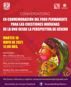 Museo de la Mujer de México: cuestiones indígenas con perspectiva de género Archivo - Archive Mayo 2021 Noticias - News 13 de mayo de 2021 El Museo de la Mujer de México invita a este conversatorio en conmemoración del Foro Permanente para las Cuestiones Indígenas de la ONU, desde la perspectiva de género. Participan: Mtra. Otilia Lux de Coty, Asesora del Programa Emblemático “Mujer Indígena del Fondo para el Desarrollo de los Pueblos Indígenas de América Latina y el Caribe” y Mtra. Arcelia García Santiago, Coordinadora en México de la Alianza de Mujeres Indígenas de Centroamérica y México. La actividad será moderada por la Dra. Gloria Ramírez (Cátedra UNESCO-UNAM, FEMU) La cita es este martes 18 de mayo a las 12 horas. Para interactuar vía Zoom, es necesario registrarse previamente al correo electrónico recepcionmuseomujer@gmail.com. Se puede sintonizra también la transmisión simultánea por Facebook. Museo de la Mujer de México: www.museodelamujer.org.mx