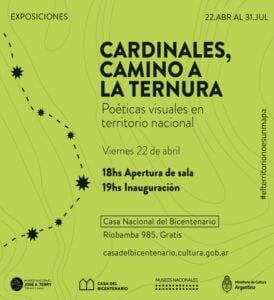 Cardinales, camino a la ternura en la Casa del Bicentenario en Buenos Aires Abril 2022 Archivo - Archive Noticias - News 21 de abril de 2022 El próximo viernes 22 de abril a las 18, se inaugura Cardinales, camino a la ternura. Poéticas visuales en territorio nacional, exhibición a cargo de artistas de Salta y Jujuy. Se trata de la primera muestra del ciclo de exposiciones colectivas El territorio no es un mapa, con la coordinación artística de Florencia Califano, que se exhibió previamente en el Museo Nacional Terry. La muestra reúne obras de doce mujeres artistas: Graciela Coronel, de Los Paños, participa con objetos, pinturas y una instalación; Milagro Tejerina, fieltrista y docente de Ledesma, con una instalación textil; la escritora Estela Mamaní, de La Quiaca, con una intervención del espacio con su poesía, y Ana López, Graciela López, Marilyn Belizane, Aurora Lucas, Patricia Pérez, Miriam Pérez, Margarita López, Estela Saavedra y Martina Arias, integrantes del grupo Tsinay Thá Chúmaás, de la comunidad wichi de La Puntana, Salta, con sus “nockattaj” (muñecas realizadas en fibra de chaguar). “Cardinal puede significar un origen, una virtud o, dentro de un mapa, las direcciones opuestas que definen el rumbo del camino. Para esta exposición fuimos construyendo una historia común desde puntos geográficos opuestos dentro de un territorio colectivo”, explica Florencia Califano. Cardinales, camino a la ternura. Poéticas visuales en el territorio nacional llega a la CNB como parte del programa de itinerancias y se exhibe en diálogo con la exposición Las olas del deseo. Feminismos, diversidades y cultura visual 2010 – 2020+. Se podrá visitar en el cuarto Se podrá visitar en el cuarto piso de la Casa hasta el 31 de julio de 2022, de miércoles a domingos de 15 a 20 en la Casa del Bicentenario, Riobamba 985, Buenos Aires, Argentina. FUENTE: Casa del Bicentenario. https://www.casadelbicentenario.cultura.gob.ar
