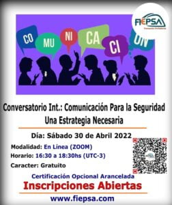 Conversatorio internacional: Comunicación para la Seguridad desde FIEPSA – Córdoba Abril 2022 Archivo - Archive Noticias - News 11 de abril de 202227 de abril de 2022 El sábado 30 de abril a las 4:30 pm hora de Argentina se realizará el conversatorio internacional en línea, Comunicación para la Seguridad: una estrategia necesaria, el cual se imparte desde FIEPSA (Fundación para la Integración Estratégica de Profesionales de la Seguridad y Afines) de Córdoba y estará a cargo de la Mag. Marisa Avogadro Thomé, directora y editora de la revista internacional Diafanís. La actividad está dirigida al público interesado en el tema de la seguridad desde cualquier lugar geográfico, ya que se efectúa a través de la plataforma Zoom y pueden participar: profesionales, estudiantes, entidades educativas y no gubernamentales, personas de las diversas fuerzas de seguridad, entre otros. La actividad es gratuita sin certificación y la certificación opcional es con un costo mínimo, es certificación privada con validez curricular de alcance internacional, acorde a el estatuto vigente IPJ Nro: 496 C/21 (4 horas cátedra) El conversatorio comienza a las 4:30 pm hora de Argentina y durante dos horas de diálogo, se presentará el tema de la comunicación para la seguridad, las ventajas que aporta este concepto a los diversos tipos de seguridad y su relación con el escenario de complejidades de la actualidad. Para registrarse para participar y conocer en detalle esta actividad, pueden escribir al e-mail: departamentoacademico@fiepsa.com, comunicarse al whatsapp: +54 9 351 8050871 y visitar la página www.fiepsa.com FUENTE: Fundación FIEPSA – Córdoba