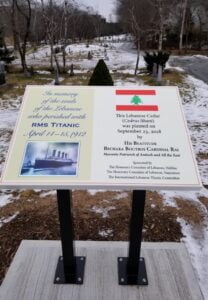In 2017, we produced a booklet commemorating these events and also the Titanic events, but more importantly, in 2018, when I became the Honorary Consul of Lebanon in Vancouver, Canada, and worked with the Honorary Consul of Lebanon in Halifax ( province of Nova Scotia Canada) with Mr. Wadih Fares, with his assistance and support we were able to install a commemorative plaque as well as planting a Lebanese cedar tree in Halifax cemetery.