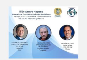 El miércoles 11 de mayo, a partir de las 9:00 am hora de Caracas, y en modalidad en línea, continúan las ponencias de reconocidos  profesionales, en el marco del II Encuentro Hispano de IFPO ( International Foundation for Protection Officers – Fundación Internacional para Oficiales de Protección). Los expositores serán: Pedro Oré, Edgardo Frigo y Carlos Seoane.