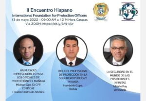 II Encuentro Hispano de IFPO: ponencias del viernes 13 de mayo Archivo - Archive Mayo 2022 Noticias - News 12 de mayo de 202212 de mayo de 2022 El viernes 13 de mayo, a partir de las 9:00 am hora de Caracas, y en modalidad en línea, continúan las ponencias de reconocidos profesionales, en el marco del II Encuentro Hispano de IFPO ( International Foundation for Protection Officers – Fundación Internacional para Oficiales de Protección). Los expositores serán: Michel Gips, Humberto Copa y y Alberto Ray Sánchez. Michel Gips quien estará presente desde los Estados Unidos, es uno de los consultores en seguridad más reconocidos a nivel mundial. Es titular de varias certificaciones profesionales internacionales. Ha sido objeto de numerosos premios a su trayectoria Es un destacado colaborador para los gremios más importantes de la industria. En la oportunidad abordará el tema de las habilidades imprescindibles para los oficiales de protección del mañana. Humberto Copa, consultor en seguridad con una amplia trayectoria profesional, miembro del Hispanic Advisor Board por Bolivia; quien se referirá a el rol del oficial de protección en la seguridad pública y privada. Alberto Ray Sánchez, consultor venezolano, investigador, conferencista y escritor, expondrá sobre la seguridad en el mundo de las posibilidades infinitas, Las personas que deseen asistir, pueden hacerlo a través del siguiente enlace, en el horario referido, desde la plataforma Zoom: Finalmente, del 9 al 13 de mayo se ha desarrollado este encuentro con la participación de expositores de reconocida trayectoria en temas de seguridad tanto pública como privada y ciudadana, provenientes de diversos países, quienes ante una numerosa cantidad de asistentes de diversas geografías, disertaron en las 5 jornadas, destacando el valor agregado que constituyen el conocimiento y la capacitación, en el abordaje de la seguridad y su escenario de complejidad e interacción. FUENTE: https://ifpo.es/