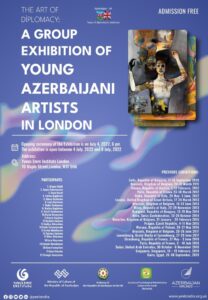 Desde el 4 al 8 de julio se realizará en Londres la exposición «El arte de la diplomacia. Exposición grupal de jóvenes artistas» y estará a cargo de artistas plásticos de Azerbaiyán, con motivo de conmemorar el 30° aniversario del establecimiento de relaciones diplomáticas entre Azerbaiyán y el Reino Unido.