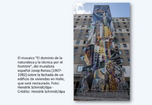 Restauran mosaico «patrimonio cultural de la RDA» de Josep Renau Archivo - Archive Noticias - News Número 15 - Julio 2022 15 de julio de 2022 lun, 2022-07-11, 16:50 Halle (Alemania), 11 jul (dpa) – Un gran mosaico del artista español Josep Renau en la fachada de una antigua vivienda de la época de la República Democrática Alemana (RDA) en la ciudad de Halle será restaurado, informó hoy una portavoz de la Fundación Wüstenrot. La vocera dijo que esta gran obra, compuesta por casi 11.000 azulejos y de 35 metros de alto y siete de ancho, fue finalizada en 1974 y se convirtió en uno de los primeros grandes proyectos de Renau en la Alemania Oriental. Este tipo de obras en el espacio público pertenecían al «patrimonio cultural de la RDA». Según explicó la portavoz de la Fundación, en la ciudad planificada de Halle-Neustadt había en aquella época un concepto político-ideológico para cada complejo de viviendas que debía transmitirse a través del arte. El encargo a Renau, quien se afincó en la RDA, fue realizado en 1968. Este bosquejó entonces las dos obras «El dominio de la naturaleza por el hombre» y «Unidad de la clase trabajadora y fundación de la RDA». Mientras que el primero fue restaurado en 2005, el segundo mural presenta ahora importantes daños, por lo que será sometido a reparación. Según la Fundación Wüstenrot, los murales del valenciano Renau (1907-1982) se encuentran entre las obras más importantes del arte vinculado con la construcción en la extinta RDA y solamente quedaron conservadas en Alemania en las ciudades de Halle y Erfurt.