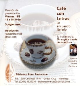 Biblioteca Pedro Arce – «Café con Letras»: un encuentro literario el 19 de agosto Agosto 2022 Archivo - Archive Noticias - News 12 de agosto de 202212 de agosto de 2022 El viernes 19 de agosto se realizará la presentación de «Café con Letras», que se llevará a cabo desde la Biblioteca Popular Pedro Arce y propuesta por la escritora Mag. Marisa Avogadro Thomé. Dicha presentación se llevará a cabo de manera virtual, a través de Google meet, el viernes 19 de agosto de 18:00 a 18:40 hora de la Argentina y para ingresar a la misma, se deben inscribir en el siguiente correo electrónico: revistadiafanis@gmail.com . Luego será enviado el enlace de ingreso a la reunión. «Café con Letras» a partir de setiembre será de modo presencial, con una reunión al mes, desde la sede de la biblioteca Pedro Arce. Marisa Avogadro Thomé es una escritora mendocina, periodista especializada en nuevas tecnologías, con 14 libros publicados de poesías y cuentos en el país y también libros en colaboración en el exterior y dirige y edita la revista internacional Diafanís. Cabe destacar que la Bilbioteca Popular Pedro Arce fue fundada en 1914 y en la actualidad tiene su sede en: Pasaje San Cristobal 1617, Godoy Cruz, Mendoza, Tel: 4525030, bibliopedroarce@hotmail.com; Facebook: Biblioteca Pedro Arce