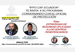 Estrategias de seguridad en centros penitenciarios: visiones argentina y ecuatoriana en el programa “Conversando con el oficial de protección” Agosto 2022 Archivo - Archive Noticias - News 22 de agosto de 202222 de agosto de 2022 El jueves 21 de agosto se realizó el programa «Conversando con el oficial de protección», encuentro de los jueves desde IFPO Ecuador, donde participaron el presidente del Capítulo Argentina de IFPO, Alejandro Lartigau junto al Mag. Klever Parra, vicepresidente de APPSTEC Ecuador, y el tema de este programa fue: Estrategias de seguridad aplicadas a los centros penitenciarios. Durante una hora, ambos expositores fueron abordando la temática penitenciaria, en sus respectivos países de pertenencia. Primero, comentando las leyes que regulan el sistema carcelario de estos países y la organización que tienen actualmente. El presidente de IFPO Capítulo Argentina resaltó la necesidad de abordar los temas de seguridad desde una óptica multidisciplinaria, haciendo hincapié en la capacitación de los profesionales de la seguridad, como un activo intangible de este proceso y de pertinencia en el tema y atender a las particularidades que ofrecen tanto los diversos escenarios de las penitenciarias en el país, como en el contexto latinoamericano. Por su parte, el vicepresidente de APPSTEC Ecuador caracterizó el sistema de su país, aportando un marco regulatorio y la situación actual, describiendo las oportunidades y las desventajas que el mismo posee. El mencionado programa que se emite por la cuenta oficial de Facebook de IFPO Ecuador, todos los jueves, tiene como anfitriones a los integrantes de ese capítulo: Edison Cadena y Patricio Quelal. El mismo puede escuchare desde el siguiente enlace: Conversando con el oficial de protección IFPO es la Fundación Internacional para Oficiales de Protección (International Foundation for Protection Officers), abocada a la capacitación en áreas de seguridad privada, con su sede central en Estados Unidos y capítulos en los cinco continentes. FUENTE: IFPO Cap. Argentina