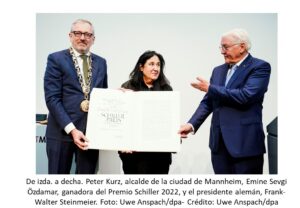 Escritora Özdamar recibe galardón literario alemán Premio Schiller Archivo - Archive Noticias - News Número 16 - Noviembre 2022 27 de noviembre de 2022 Mannheim (Alemania), 27 nov (dpa) – El presidente alemán, Frank-Walter Steinmeier, alabó hoy la obra de la escritora de origen turco Emine Sevgi Özdamar al hacerle entrega del Premio Schiller de la ciudad de Mannheim. «Usted juega con sus propios recuerdos y su narrativa literaria y hace que surja algo completamente nuevo en el lenguaje: su propio lenguaje, brillante, poético, triste, muy cómico, resumiendo, su exuberante lenguaje», dijo Steinmeier. «Se desenvuelve en la lengua alemana de una manera magistral como lo hacen solo muy pocas personas cuya lengua materna es el alemán», añadió. Özdamar, de 76 años, es oriunda de Turquía y vive a caballo entre Turquía y Berlín. Entre sus novelas más conocidas figura «La vida es un caravasar». El Premio Schiller está dotado con 20.000 euros (casi 21.000 dólares). La ciudad de Mannheim lo concede cada dos años a personalidades «que a través de su obra contribuyen al desarrollo cultural de una manera extraordinaria». La distinción lleva el nombre del dramaturgo alemán Friedrich Schiller, cuya obra «Räuber» («Los bandidos») se estrenó en Mannheim en 1792. La escritora, actriz y directora de teatro, nació en Malatya (Turquía) el 10 de agosto de 1946. En 1991 recibió el premio Ingeborg Bachmann por «La vida es un caravasar». El libro es autobiográfico, al igual que las obras posteriores «El puente del Cuerno de Oro» (1998) y «Extrañas estrellas» (2003). Las tres novelas fueron muy alabadas por la crítica debido a su calidad literaria. Lo mismo ocurre con su obra más reciente: «Ein von Schatten begrenzter Raum» (un espacio delimitado por las sombras), publicada en 2021. La autora creció en Estambul y Bursa. Llegó por primera vez a Berlín Occidental en 1965. Tras el golpe militar en Turquía en 1971, regresó a Berlín. En la década de 1980, comenzó a escribir en Alemania. Steinmeier, que reiteró que para él Alemania es un «país con trasfondo migrante», opinó que no se escucha lo suficiente a los inmigrantes. «Todos los que vienen trajeron su historia y sus relatos», señaló. «Estoy convencido de que estos tienen que formar una parte mucho más importante de nosotros», continuó. «Sus historias son parte de la nuestra y de nuestra historia común». Durante la ceremonia de entrega, Özdamar relató que ella y su hermano leyeron de niños una edición turca de «Guillermo Tell» de Schiller y que la querían interpretar. Ambos querían ser el héroe que da nombre a la obra. También comentó que, de joven, durante una visita a Weimar, cogió flores del antiguo jardín de Johann Wolfgang von Goethe y las pegó en su diario de 1976 sobre una imagen de Schiller. Quizá, dijo, porque en el retrato «estaba particularmente hermoso».