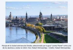 «Lonely Planet» elige Dresde como uno de los mejores destinos en 2023 Archivo - Archive Noticias - News Número 16 - Noviembre 2022 18 de noviembre de 2022 Nueva York, 16 nov (dpa) – La ciudad alemana de Dresde se cuenta entre los mejores destinos turísticos para el próximo año, de acuerdo con la famosa guía turística «Lonely Planet», que dio a conocer hoy su lista online «Best Travel 2023». La capital del estado federado de Sajonia ocupa un lugar en la lista junto a ciudades como la capital de Perú, Lima, la capital de Uruguay, Montevideo, y la capital de Ghana, Acra, o países como Guyana y Albania. «El ‘Altmarkt’ reabrirá con criterios de accesibilidad y de protección del clima», elogia la guía sobre la ciudad alemama. «A un lado del (río) Elba, el casco antiguo cuidadosamente reconstruido, al otro el centro moderno con cerveza artesanal, cocina internacional y gran arte callejero», añade. Es la decimaoctava vez que la marca «Lonely Planet», fundada en 1973, recomienda destinos turísticos para el año que vendrá. Sin embargo, ya no hay un libro «Best Travel», y tampoco ubicaciones entre las mejores diez ciudades, países y regiones. En lugar de ello, hay 30 destinos en cinco categorías como «comida» y «relajarse». Dresde se ubica bajo «Conocer cosas nuevas» junto a ciudades como Marsella en Francia o Manchester en Inglaterra. La última vez, cuando aún se editó como libro la guía «Lonely Planet Best in Travel 2022», la ciudad alemana de Friburgo de Brisgovia quedó en tercer lugar entre las ciudades de todo el mundo.