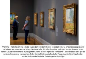 Muestra alemana exhibe óleo de Monet que da nombre al impresionismo Archivo - Archive Noticias - News Número 17 - Marzo 2023 14 de marzo de 2023 Potsdam (Alemania), 22 feb (dpa) – Una nueva exposición en el Museo Barberini de la ciudad alemana de Potsdam estará dedicada al sol, desde la antigua Grecia hasta la actualidad, y contará con obras de renombrados artistas, comunicó hoy la directora de la entidad, Ortrud Westheider. El eje de la muestra será el óleo de Claude Monet: «Impresión, sol naciente». Esta conocida obra del impresionista francés de 1872 es un préstamo proveniente de Francia. Según el Museo Barberini, verlo fuera de París es muy poco habitual. De acuerdo a lo comunicado, la pintura llegó hace poco a Potsdam en medio de estrictas medidas de seguridad y se podrá ver en el Barberini en las primeras ocho semanas de exposición. La exposición con el título «Sol. La fuente de luz en el arte» estará abierta al público entre el 25 de febrero y el 11 de junio y abarca un total de 130 piezas. Entre ellas, no solo habrá cuadros, sino también esculturas, fotografías y reproducciones gráficas. Entre otras, se podrán apreciar obras de Caspar David Friedrich, William Turner y Edvard Munch. Los préstamos provienen de más de 60 museos y colecciones personales. La muestra fue gestada en conjunto con el Museo Marmottan Monet de París. De esa entidad proviene la famosa obra «Impresión, sol naciente», que también le dio el nombre de impresionismo a ese movimiento artístico.