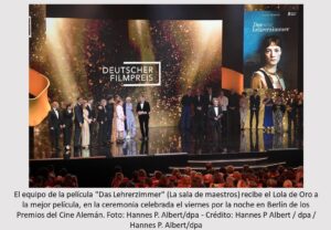 «Das Lehrerzimmer» gana como mejor película en Premios del Cine Alemán Archivo - Archive Mayo 2023 Noticias - News 13 de mayo de 2023 Berlín, 13 may (dpa) – La película «Das Lehrerzimmer» (La sala de maestros) se impuso de manera sorprendente a «Sin novedad en el frente» en la categoría de mejor película (Lola de Oro) en los Premios del Cine Alemán, en una ceremonia celebrada el viernes por la noche en Berlín. En el film, el director Ilker Çatak narra la historia de un conflicto en una escuela. La película, protagonizada por la actriz Leonie Benesch, obtuvo cinco premios. Benesch, reconocida como mejor actriz protagonista, interpreta a una profesora que quiere resolver una serie de robos en su escuela y decide poner en secreto una cámara en la sala de profesores. La película se proyecta actualmente en los cines alemanes y versa sobre la dinámica que puede surgir entre las personas. Su trama puede entenderse como un comentario acerca de una cultura del debate que gira más en torno a la indignación que al entendimiento mutuo. Çatak recibió el Lola, como así se denominan a los premios, al mejor director. Al recoger el premio, dijo que había crecido con las películas del también alemán Fatih Akin. «Era una guía a la que poder admirar. Y te doy las gracias por ello, Fatih», comentó. Por lo demás, el film de temática bélica dirigido por Edward Berger confirmó su papel de gran favorita y logró hacerse con nueve galardones, entre ellos el Lola de Plata, que se suman así a los cuatro premios Oscar que logró en la pasada edición de los galardones de la Academia de Cine estadounidense. Los actores Felix Kammerer y Albrecht Schuch recibieron sendos Lola al mejor actor protagonista y secundario. La cinta, adaptación de la obra literaria de Erich Maria Remarque, acudía a la cita con 12 nominaciones, más que ninguna otra película para este galardón en Alemania. La novela de Remarque (1898-1970) es considerada un clásico de la literatura antibélica y se convirtió inmediatamente en un éxito de ventas tras su publicación en 1929. El libro describe los horrores de la Primera Guerra Mundial (1914-1918) desde la perspectiva de un joven soldado. Según la Academia de Cine Alemán, «Sin novedad en el frente» fue la primera producción de un proveedor de ‘streaming’ nominada al Premio Alemán de Cine. En Berlín, obtuvo además premios por la música, el trabajo de cámara y el sonido. El Lola de Bronce fue para el thriller «Holy Spider», dirigida por el director iraní Ali Abbasi, y que trata sobre un asesino de mujeres en Irán. El director Volker Schlöndorff («El tambor de hojalata») fue galardonado por sus destacados servicios al cine alemán. La estrella de Hollywood John Malkovich y otros cineastas rindieron homenaje a su obra a través de un vídeo proyectado en la ceremonia. De forma similar al procedimiento que se implementa en Estados Unidos, los miembros de la Academia del Cine de Alemania también votan sobre los ganadores y ganadoras. Las distinciones y nominaciones están dotadas en total con tres millones de euros (unos 3,3 millones de dólares) de fondos públicos. Este dinero procede del presupuesto de la Secretaría de Estado de Cultura. La encargada de la institución, Claudia Roth, aprovechó el acto para hacer referencia al debate abierto sobre posibles casos de acoso y hostigamiento en el sector. En su discurso, pidió transparencia y un debate honesto y abierto para lograr una mejora laboral. «No podemos tolerar ni toleraremos un clima de miedo», declaró. Tras un reportaje publicado por el semanario «Spiegel» sobre un supuesto acoso y un «clima de miedo» durante el rodaje de la película «Manta Manta – Zwoter Teil», del director Til Schweiger, la productora de la misma anunció una investigación sobre los posibles incidentes en el plató de grabación. El abogado de Schweiger declaró a «Der Spiegel» que algunos de los hechos denunciados «no eran conocidos» por su cliente, mientras que otros eran «inexistentes». Denunció que los «rumores que habían estado circulando durante años fueron presentados erróneamente como hechos». El propio Schweiger no ofreció declaración alguna a dpa.