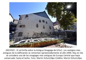 Barrio judío medieval de ciudad alemana: Patrimonio Mundial de la Unesco Archivo - Archive Noticias - News Setiembre 2023 17 de septiembre de 2023 Erfurt/Riad, 17 sep (dpa) – La Unesco designó hoy como nuevo Patrimonio de la Humanidad el centro histórico judío medieval de la ciudad de Erfurt, en el este de Alemania. Así lo decidió la Organización de las Naciones Unidas para la Educación, la Ciencia y la Cultura (Unesco) durante la sesión que se celebró en Riad (Arabia Saudí). Se distinguió a distintas edificaciones del casco antiguo de la ciudad, como un baño ritual medieval (Mikve) descubierto por casualidad hace 16 años, la llamada Casa de Piedra que se habría construido alrededor del año 1250, así como a la Antigua Sinagoga de Erfurt. En Alemania hay actualmente 52 sitios reconocidos como Patrimonio de la Humanidad. «La admisión del patrimonio medieval judío de Erfurt como segundo sitio judío en la lista del Patrimonio Mundial de la Unesco hace un nuevo e importante aporte para visibilizar las raíces comunes de judíos y cristianos en Alemania y Europa y para preservarlas en el futuro», dijo la embajadora alemana ante la Unesco, Kerstin Püschel. Hace dos años, la Unesco condecoró por primera vez a bienes culturales judíos en Alemania. Los llamados sitios Schum de Maguncia, Worms y Espira recibieron el título de Patrimonio Mundial como cuna del judaísmo europeo. La Antigua Sinagoga de Erfurt está considerada como una de las más antiguas sinagogas que haya conservado hasta el techo en Europa Central. Tras un pogromo en la ciudad en 1349, en el que prácticamente toda la comunidad judía fue aniquilada, la sinagoga se convirtió primero en almacén y más tarde se utilizó como restaurante y sala de baile. La ciudad supone que por este motivo el edificio se salvó más tarde de la destrucción de los nazis.