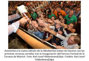 Múnich inaugura la Oktoberfest y espera seis millones de asistentes Archivo - Archive Noticias - News Setiembre 2023 17 de septiembre de 202317 de septiembre de 2023 Múnich, 16 sep (dpa) – Con dos golpes de martillo, el alcalde de Múnich abrió hoy al mediodía el primer barril de cerveza y dio comienzo a la tradicional Fiesta de la Cerveza con el grito «O’zapft is!» (¡Ya está abierto!, en bávaro). Acto seguido, Dieter Reiter le entregó la primera jarra de cerveza al primer ministro de Baviera, Markus Söder, y brindó con él por la nueva edición de la fiesta también conocida como «Wiesn» (abreviatura de «Theresienwiese», el «Prado de Teresa», el lugar donde se celebra el evento). El estruendo de los petardos anunció la apertura de la fiesta y de los grifos de cerveza. Bajo un sol radiante, los taberneros de la «Oktoberfest» llegaron al recinto del festival en coches de caballos. Después de una lluviosa edición en 2022, con temperaturas que en ocasiones llegaron a los diez grados, ahora esperan un tiempo soleado y otoñal para los próximos días del festival. A primera hora de la mañana, los primeros fanes de la «Wiesn» esperaban a que abriera el recinto del festival, en su mayoría portando el «dirndl», el vestido femenino tradicional, o los «lederhosen», los pantalones de cuero masculinos. Cuando se abrieron las puertas, hacia las 9:00 horas locales, cientos de personas corrieron hacia las carpas del festival para conseguir un buen sitio. Entre los asistentes al festival, estaba el bisnieto del último rey bávaro, Franz Herzog von Bayern. Se esperan unos seis millones de visitantes hasta el 3 de octubre, como mínimo. El año pasado tan solo acudieron unos 5,7 millones de visitantes, aunque en esta edición ya no hay preocupaciones por el coronavirus. El festival en 2023 durará 18 días, dos más de lo habitual. Se lo ha prolongado más allá del primer fin de semana de octubre, hasta el 3 de octubre, que será martes. La cerveza de la «Oktoberfest» tiene más mosto original que la cerveza tipo Helles (rubia). Además, el contenido de alcohol es un punto porcentual más alto, entre el 5,9 y el 6,3 por ciento. La tradición es beber al menos una jarra de cerveza de un litro, conocida como «Mass», que este año costará entre 12,60 y 14,5 euros (13,50 y 15,50 dólares). Las elecciones estatales de Baviera del 8 de octubre no desempeñarán ningún papel durante la fiesta. Las normas prohíben los actos políticos, incluidas las campañas electorales. La policía está de servicio con unos 600 agentes. En el puesto de socorro de Wiesn hay 450 paramédicos y 55 médicos. Además, más de 2.000 vigilantes ayudan en las entradas y en las carpas.