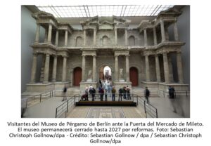 Largas colas en Museo de Pérgamo de Berlín antes de cierre hasta 2027 Archivo - Archive Noticias - News Octubre 2023 23 de octubre de 2023 Berlín, 22 oct(dpa) – Largas colas se formaron hoy ante las puertas del famoso Museo de Pérgamo de Berlín, en el último día antes de su cierre hasta 2027 por reformas. Según el museo, unos 5.000 visitantes podrán echar un último vistazo a la Puerta de Ishtar o a la Vía Procesional de Babilonia a través de las franjas horarias reservadas hasta las 21 horas (local) de hoy. El Museo de Pérgamo, que incluye la Colección de Antigüedades Clásicas, el Museo del Cercano Oriente Antiguo y el Museo de Arte Islámico, es uno de los museos alemanes más populares y atrae a más de un millón de visitantes al año. Permanecerá completamente cerrado durante al menos cuatro años. La sección A con el Altar de Pérgamo fue cerrada en 2013 y reabrirá en 2027. El Altar de Pérgamo es, junto al busto de la reina egipcia Nefertiti, la pieza más valiosa del patrimonio cultural antiguo de Berlín. La monumental construcción fue erigida en la segunda mitad del siglo II antes de Cristo en Pérgamo, la ciudad del Asia Menor fundada por Alejandro Magno a orillas de la costa actual de Turquía. La sección B también permanecerá cerrada desde este lunes. Pasarán 14 años hasta que todo el Museo de Pérgamo vuelva a estar abierto en 2037. El coste total de las obras podría ascender a 1.500 millones de euros (15.900 millones de dólares). «La restauración nos ofrece una oportunidad muy especial para conservar mejor los objetos en el futuro y presentarlos de una forma más accesible», declaró a dpa Barbara Helwing, directora del Museo del Cercano Oriente Antiguo. «Ahora estamos poniendo a prueba las antiguas restauraciones, desarrollando modernos conceptos expositivos y escribiendo nuevas historias que nos gustaría compartir con nuestros visitantes muy pronto como parte de exposiciones especiales e intermedias». Aunque se renueve el edificio, el Museo de Pérgamo seguirá siendo visible en Berlín, aseguró. Stefan Weber, director del Museo de Arte Islámico, habló de la ilusión de todo el equipo por disponer de nuevos espacios de exposición, un clima estable, un acceso sin barreras y un techo hermético. «Llevamos años trabajando de forma muy concentrada en las nuevas áreas de exposición», indicó Weber. «El cierre es ahora en realidad también el pistoletazo de salida para la ronda final de la mudanza dentro del Museo de Pérgamo». Weber anunció una exposición para después de la renovación «que también marcará nuevas pautas en el plano internacional».