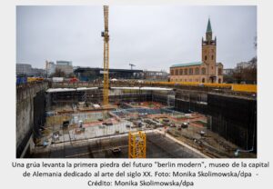 Colocan piedra fundamental de museo «Berlin modern» en la capital alemana Archivo - Archive Febrero 2024 Noticias - News 10 de febrero de 2024 Berlín, 9 feb (dpa) – La piedra fundamental del «berlin modern», futuro museo de la capital de Alemania dedicado al arte del siglo XX y considerado la obra cultural más costosa del país, fue colocada hoy en presencia de autoridades. La culminación de los trabajos en las inmediaciones del Potsdamer Platz, en el corazón de Berlín, está prevista para 2027, con un costo de alrededor de medio millón de euros (unos 539.000 dólares). El «berlin modern» se convertirá en la séptima sede de la Galería Nacional (Nationalgalerie). Klaus Biesenbach, director de la Nueva Galería Nacional, así como también del futuro museo, subrayó la urgencia de disponer de más espacio, ya que en la actualidad solamente pueden exponerse 172 de las aproximadamente 5.000 obras que componen la colección. La secretaria de Estado de Cultura de Alemania, Claudia Roth, recordó por su parte la persecución de numerosos y numerosas artistas durante el nazismo. «La libertad en el arte vuelve a ser cuestionada hoy en día», advirtió la política de Los Verdes. Esto, dijo Roth, representa «un desafío al que nos enfrentamos de forma activa». A su vez, el alcalde de Berlín, Kai Wegner, defendió el proyecto. «El museo está muy justificado y es absolutamente necesario», declaró el político de la Unión Demócrata Cristiana (CDU), añadiendo que llena un doloroso vacío. El «berlin modern» estará ubicado entre los icónicas edificios de la Nueva Galería Nacional y la Filarmónica de Berlín. Durante mucho tiempo, el proyecto suscitó polémicas por su deficiente balance energético. Roth quiere convertirlo en un «modelo de sostenibilidad». Para cumplir con esa meta, debieron ser revisados los planos del museo, que se encuentra en construcción desde 2019. El diseño y la remodelación están a cargo de los arquitectos suizos Herzog & de Meuron, que también construyeron la Filarmónica del Elba en Hamburgo, el Estadio Olímpico de Pekín y el estadio Allianz Arena de Múnich. A partir de esta modificación de los planes originales, la obra financiada por el Gobierno se encareció unos 363 millones de euros. Con los incrementos de los índices y los costes de riesgo, la financiación asciende a unos 450 millones de euros. Con motivo de la colocación de la piedra fundamental, la Nueva Galería Nacional expone desde mañana la videoinstalación «Ready Mix», de la artista estadounidense Lucy Raven. Se la podrá ver en el gran salón de la célebre construcción del arquitecto Ludwig Mies van der Rohe (1886-1969). «La colocación de la primera piedra debe ser ya de por sí arte«, comentó el director Biesenbach.
